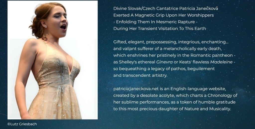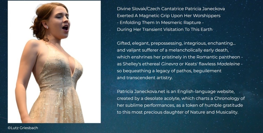 Patricia Burda Janeckova died on 1st October 2023. We who marvelled as she overcame the prohibitive improbability inherent in the attainment of teenage operatic accomplishment, and equally at her inexpressibly refined and feminine bearing, later but too soon were made unwilling witnesses as the obverse manifestation of the random hand of fateful chance – dealt down darkly upon our cherished diva, our reluctant bashful primadonna – unfolded inexorably and inscrutably, ignoring all entreaties to preserve the stellar songbird, to desist from shearing the blossoming talent in its bud, and instead wantonly summoned its unknowing recipient to her prescribed destiny, consigning us, her mystified and bereft devotees, to the senseless void of incomprehension†