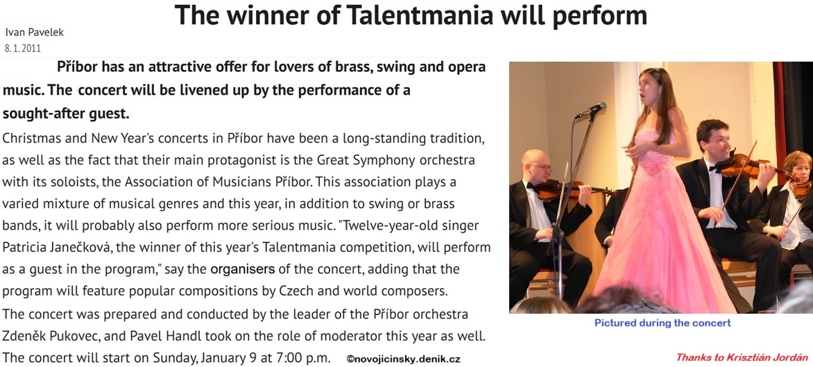 In December 2010, with a record number of audience votes, she became the absolute winner of the Czechoslovak talent show Talentmania, in which she won huge favour and recognition in Slovakia and the Czech Republic. She has been singing since the age of four and is undoubtedly an exceptional phenomenon on the contemporary music scene. The professional music public highlights above all her immense musical maturity, purity of intonation and refined voice, which is also why immediately after the competition she became one of the most sought-after young opera singers in the Czech Republic and Slovakia.
